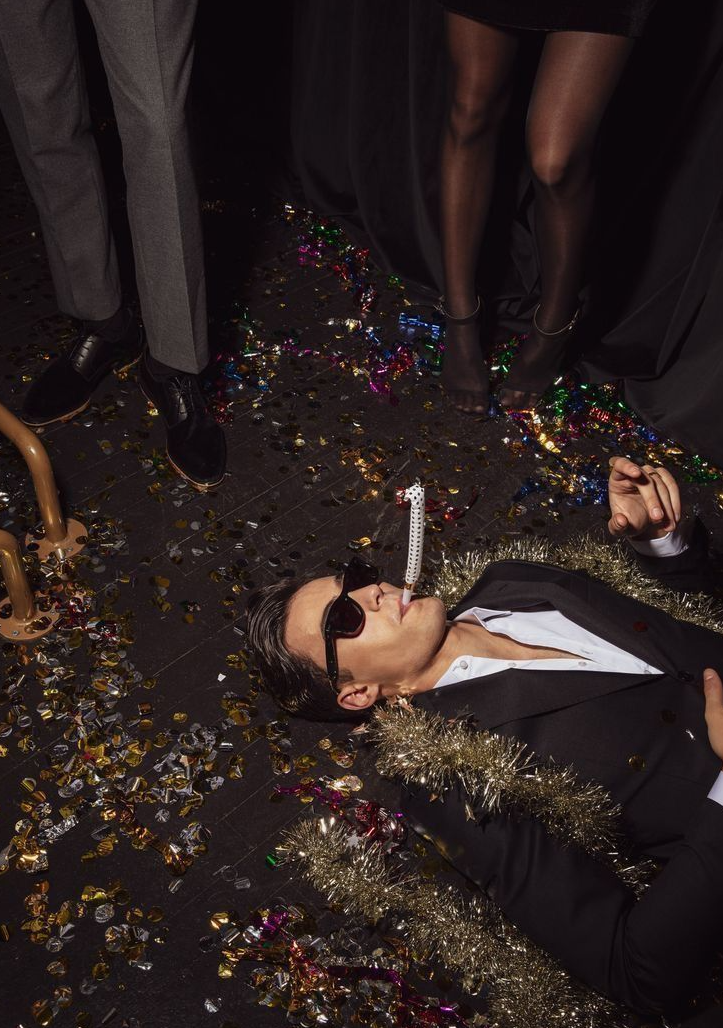 Сцена 11 — В костюме и шубе за столом с яркими хлопьями. Максимально комично и с серьезным лицом
