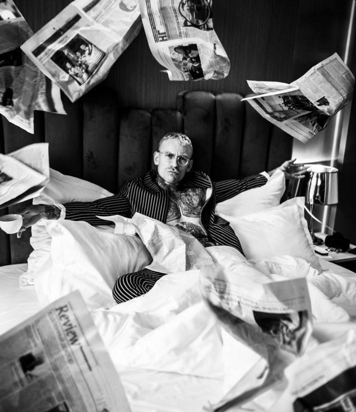 Сцена 1 — Спальня. Просыпание в кровати. Слева и справа две неизвестные девушки. (В идеале нужно взять жену которая будет отснята с двух сторон, лица не будет видно. В фотошопе все кадры соединю в один и поменяю цвет/длину волос на другие). Сам кадр с максимальным бардаком. Вокруг разбросаны туфли и женское белье (чулки, лифчики, трусики), на одной руке наручники, всю лицо в следах от помады в форме поцелуя (Ну это точно надо жену брать с собой))